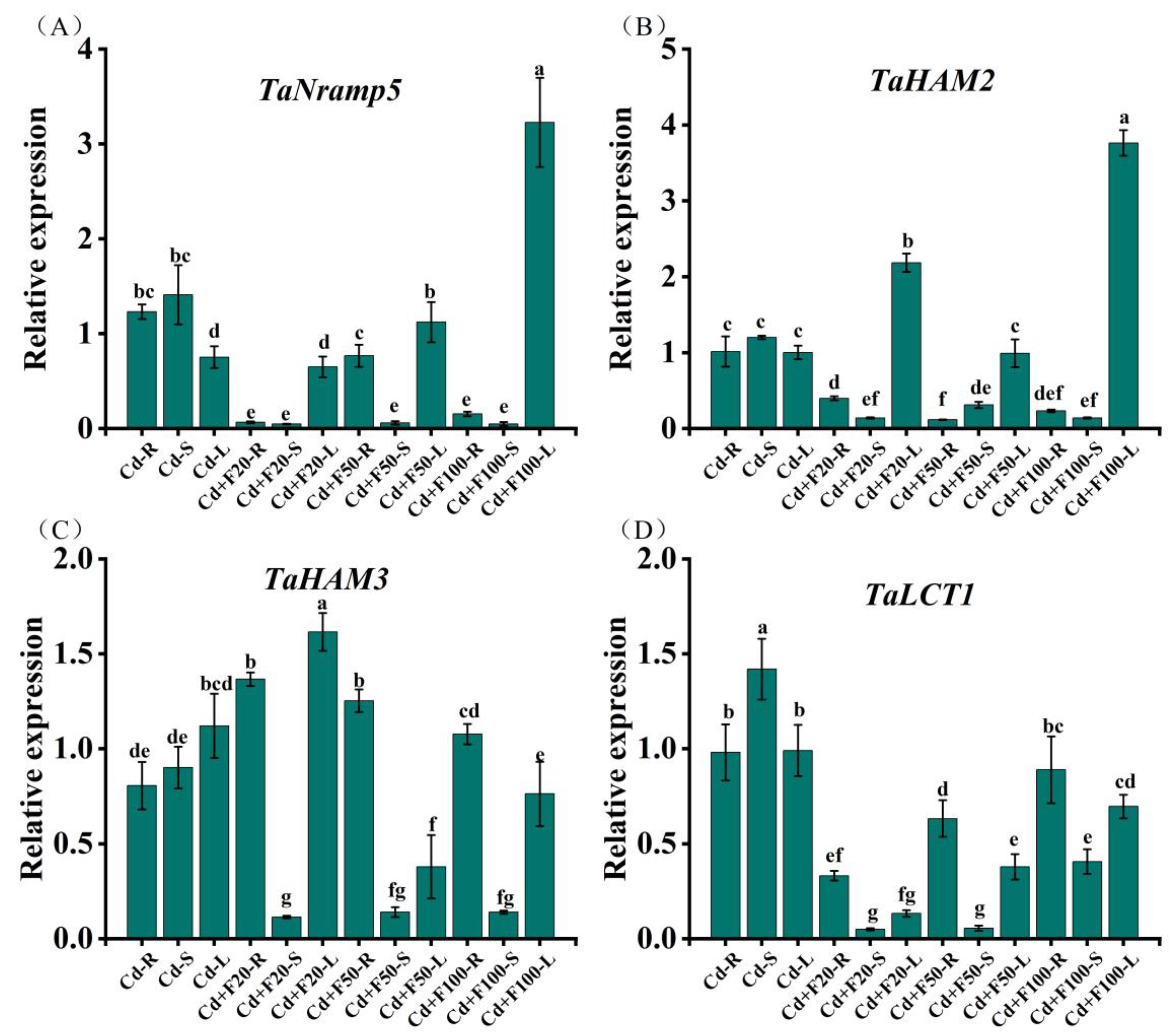 | Cd + FA100 | 363.10 ± 27.07 e | 57.78 ± 1.97 e | 1.21 ± 0.03 de | 0.53 ± 0.03 a | 403.33 ± 31.27 f |