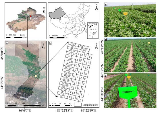 Location of study area and distribution of sampling plots: (a) Manas county, (b) sampling plots, and (c–e): photo of experimental field.