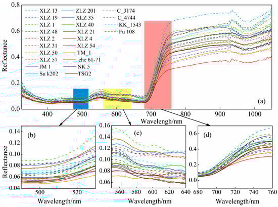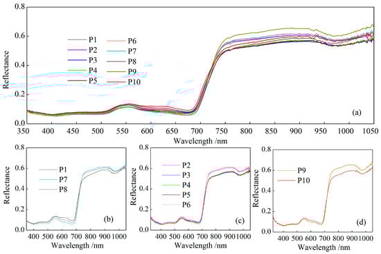 Spectral curve of cotton leaves under different phosphate treatments: (a) all 10 gradients, (b) straw–phosphorus combinations, (c) five phosphorus gradients, and (d) organic fertilizer treatments.
