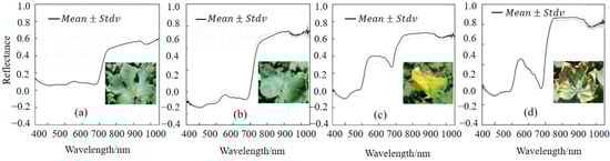 Spectral curves and standard deviations of cotton leaves under different phosphorus stresses: (a) health status, (b) phosphorus deficiency stage 1, (c) phosphorus deficiency stage 2, and (d) phosphorus deficiency stage 3.