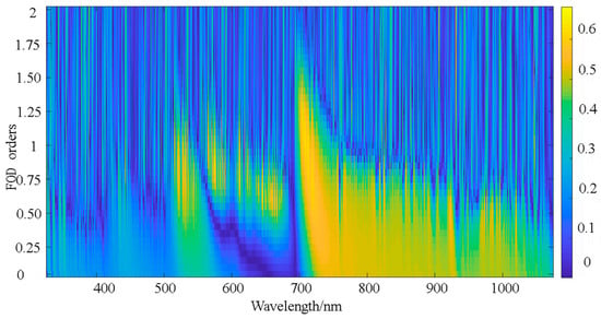 Fractional Differential Order (FOD), as an extension of integer-order differentiation, has demonstrated significant advantages in reducing background noise and enhancing spectral information. Based on this, we employed the Grünwald–Letnikov (G–L) fractional differential equation to process spectral data within the differentiation range of 0 to 2 orders, using a step size of 0.1. The definition of FOD is as follows []: