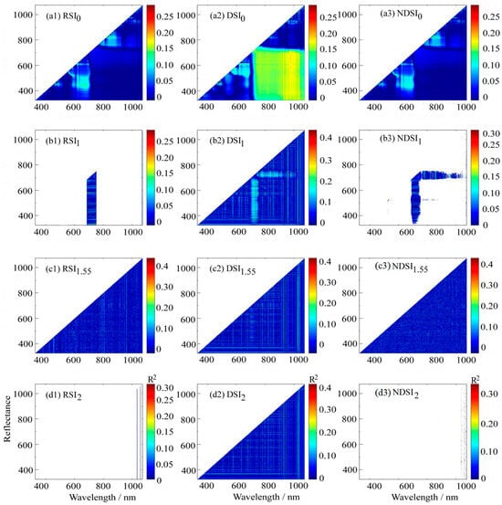 Figure 7(d1)–(d3) shows that after second-order derivative transformation, the optimized indices were RSI (606 nm, 1060 nm), DSI (839 nm, 452 nm), and NDSI (522 nm, 341 nm), achieving R2 values of 0.3, 0.409, and 0.3, respectively.