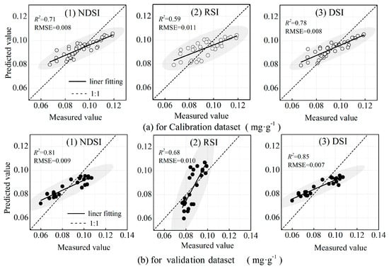 Figure 7(c1)–(c3) presents the results based on 1.6 order, where the optimized spectral indices were RSI (852 nm, 737 nm), DSI (839 nm,452 nm), and NDSI (491 nm,487 nm), with R2 values of 0.459, 0.415, and 0.409, respectively.