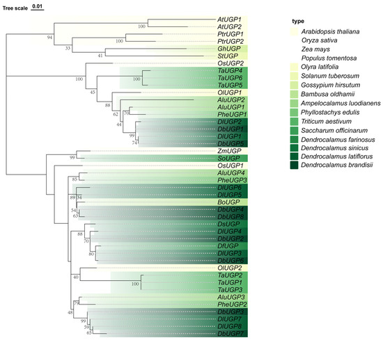 Li, H.; Wu, C.; Li, X.; Xu, J.; Cheng, Z.; Gao, J. Characterization, Expression Profile Analysis, and Functional Prediction of UGP Gene Family in Dendrocalamus brandisii. Plants 2025, 14, 1458. https://doi.org/10.3390/plants14101458