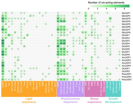 2.4. DbUGPs Promoters Mainly Responded to Light, MeJA, and ABA