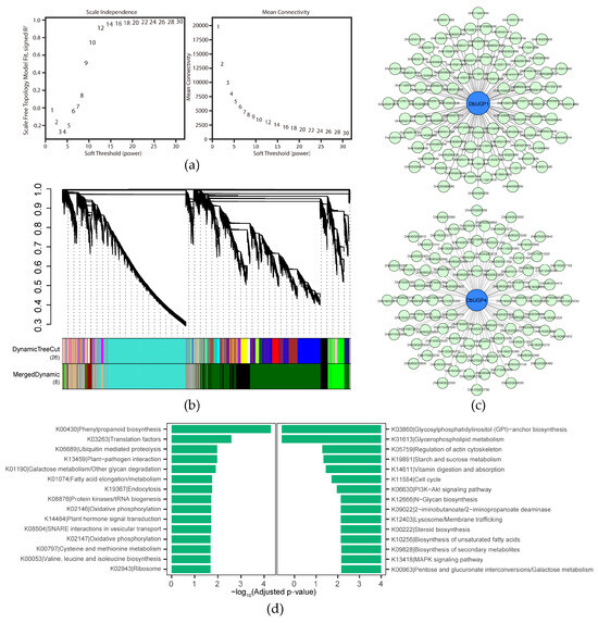 2.8. WGCNA, PPI, and KEGG Analyses Suggested DbUGP1 and DbUGP4 Involvement in Growth, Metabolism, and Stress Adaptation