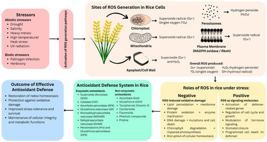 As summarized in Figure 1, ROS generated under various stress conditions exhibit dual functions in rice, acting as both signaling molecules and agents of cellular damage, counteracted by the antioxidant defense system. Schematic diagram illustrating the generation of reactive oxygen species (ROS), their dual roles, and the antioxidant defense system in rice (Oryza sativa) under oxidative stress. Abiotic and biotic stressors trigger ROS production in multiple subcellular compartments. While moderate ROS levels function in signaling to activate defense responses, excessive ROS cause oxidative damage. The rice antioxidant defense system—comprising enzymatic and non-enzymatic components—mitigates ROS accumulation, restores redox balance, and enhances stress tolerance.
