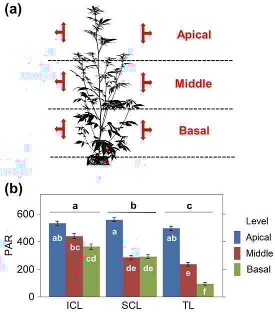 (a) Diagram depicting the measurements conducted at the defined levels: apical, middle, and basal thirds. At each level, measurements were taken in multiple directions (indicated by red arrows), and the PPFD recorded in each orientation was combined and averaged to determine the average PAR for each level. (b) Distribution of PAR (PPFD, μmol·m−2·s−1) throughout the canopy across the different treatments. Data were analyzed by 2-way repeated-measures ANOVA. Means and standard errors are represented. Statistical differences in total PAR received among treatments are noted above the bars. Different letters denote significant differences (Tukey HSD, p ≤ 0.05).