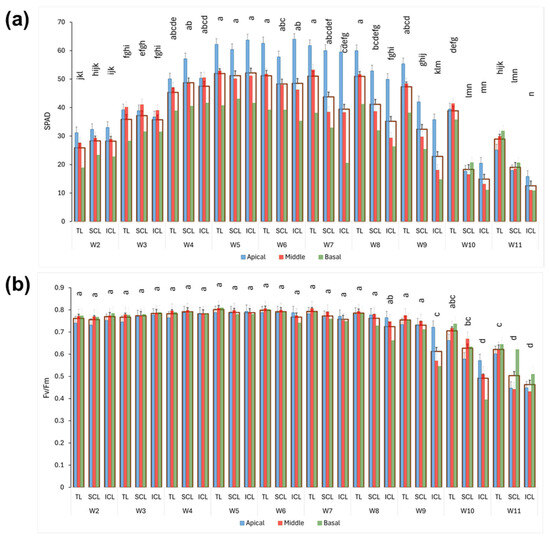 (a) SPAD values of youngest fully developed fan leaves. (b) Fv/Fm values of youngest fully developed fan leaves. Wide bars show the mean value of whole plant, and inner bars represent the means for each fraction. Weekly values (means and standard errors, from weeks 2 to 11, W2 to W11) are depicted. Different letters denote significant differences (Tukey HSD, p ≤ 0.05) between the mean values of whole plants.