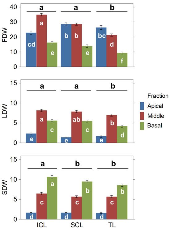 Dry biomass fractions (FDW, LDW, and SDW, in grams) obtained per plant fraction and treatment. Means and standard errors are represented. Statistical differences among treatments are noted above the bars. Different letters denote significant differences (2-way ANOVA and Tukey HSD, p ≤ 0.05).