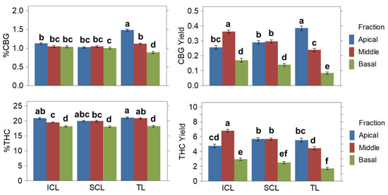 The concentrations and yields of total THC and CBG were examined in different parts of the cannabis plants and among treatments. The results are summarized in Table 3. It was found that treatments differ significantly in the cannabinoid concentration and yield distribution throughout the apical, middle, and basal canopies. Regarding the treatments, the TL treatment resulted in higher concentrations of CBG and THC compared to SCL and ICL. However, ICL yielded significantly higher amounts of CBG compared to SCL and TL (around 11% more), while SCL and ICL yielded more of the main cannabinoid, THC (18.67% and 24.42% more, respectively) than TL. Additionally, the apical and middle fractions yielded significantly more cannabinoids than the basal fraction (Figure 4). Thus, the SCL and ICL treatments affected both the overall yield per plant and its distribution.