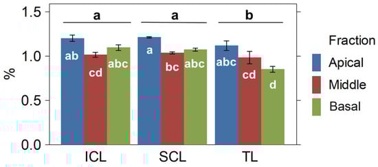 The variability in production was assessed by calculating the CV between the whole plants and the plant fractions for each treatment. The SCL and ICL treatments led to substantial reductions in the variability of FW, TDW, and FDW between whole plants (Table S3). There was also a decrease in CV for LDW and SDW, although to a lesser extent. Moreover, the SCL and ICL treatments showed noticeable reductions in the CVs for FDW, LDW, and SDW between canopy fractions.