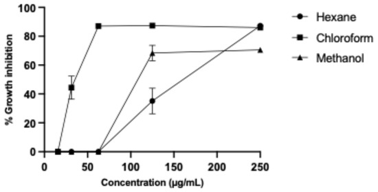 B. subtillis ISE-B27 was fermented in 120 mL of ISP2 broth (Sigma-Aldrich, St. Louis, MO, USA) for three days under shaking (120 rpm) at 28 ± 2 °C. Cultures were then centrifuged at 4500 rpm for 10 min, separating the biomass from the supernatant. Methanol extracts were prepared by macerating for 48 h and then suspending 50 g of the biomass in 100 mL of methanol [27]. Next, the solvent was filtered and evaporated in a rotary evaporator (Buchi R-3000; Brinkman Instruments, Inc., Westbury, Long Island, NY, USA). Fractionation was performed from the crude methanol extract in a Soxhlet apparatus with 500 mL of hexane, chloroform, and methanol for 24 h with each solvent. Once the fractionated extracts were obtained, they were evaporated and reconstituted with dimethyl sulfoxide (DMSO; Sigma-Aldrich, St. Louis, MO, USA) and stored at −20 °C until use. Extract yields were analyzed using the following formula: % yield = [(gram of dry extract/gram of biomass) (100)].