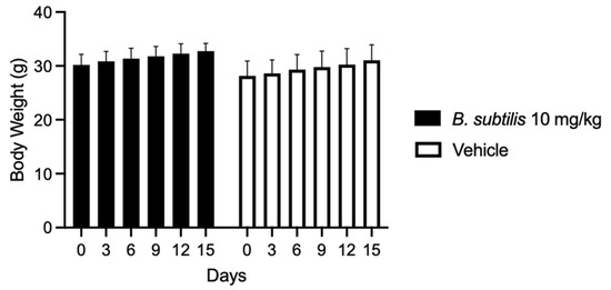 Body weight variation in mice treated with B. subtilis extract and vehicle for 15 days.