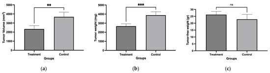 Tumor volume, tumor weight, and tumor-free weight of female BALB/c mice treated with chloroform-based partition (10 mg/kg) from ISE-B27 (B. subtilis) bacterial extract. (a) Tumor volume, (b) tumor weight, and (c) tumor-free weight. ** p < 0.01; *** p < 0.001; ns: not significant.