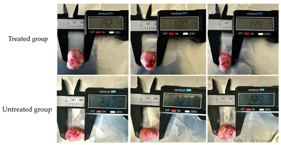 Effect of chloroform-based partition (10 mg/kg) from ISE-B27 (B. subtilis) bacterial extract on tumor size. Tumors of the untreated group were significantly larger compared to those of the treated group.