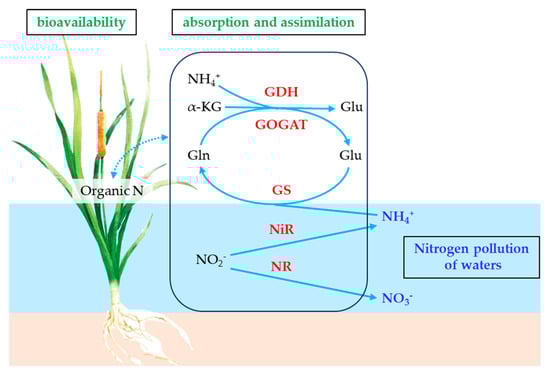 Nitrogen (N) plays a crucial role in plants’ physiological metabolism, growth, and development, as well as in the nutrient cycling of ecosystems [1]. As a key component of aquatic ecosystems, aquatic plants are capable of efficiently absorbing N from water and assimilating it into organic N, such as amino acids and proteins, via N assimilation enzyme activity. This process not only supports plants’ growth and metabolism, but also contributes to reducing N concentrations in the water [2]. Consequently, aquatic plants are essential for N cycling and water quality improvement in aquatic systems, making them a significant current focus of research [3]. Different forms of N significantly influence the efficiency of N metabolism and the ecological functions of plants by modulating the activities of key enzymes that are involved in N assimilation [4]. Plants convert inorganic N into organic N via enzyme systems, including nitrate reductase (NR), nitrite reductase (NiR), glutamine synthetase (GS), glutamate synthase (GOGAT), and glutamate dehydrogenase (GDH). This process is fundamental to N uptake and assimilation in plants [5]. As illustrated in Figure 1, the N uptake and assimilation processes in plants proceed as follows: Aquatic plants are proficient at directly absorbing dissolved nitrogenous compounds from the substrate through their roots, especially ammonium nitrogen (NH4+-N) and nitrate nitrogen (NO3−-N). The absorbed N is subsequently transported to various plant organs, such as stems and leaves. Through enzymatic activities associated with N assimilation, these inorganic N forms are converted into organic molecules, such as amino acids and proteins [6]. This process not only facilitates nutrient storage within the plant, but also significantly contributes to its growth and metabolism, thereby reducing nitrogenous pollutants in aquatic environments [2,7]. The primary biochemical pathways that are involved include the following: (1) Nitrate reduction, which occurs when NR in the cytoplasm reduces nitrate ions (NO3−) to nitrite ions (NO2−), which are further reduced to ammonium ions (NH4+) by NiR located in the chloroplasts and plastids of root cells. (2) Ammonium assimilation, a process in which GS in the cytoplasm and plastids catalyzes the reaction between NH4+ and glutamic acid (Glu) to form glutamine (Gln). Subsequently, GOGAT in the chloroplasts and root cells catalyzes the reaction between Gln and α-ketoglutaric acid (α-KG) to produce two molecules of Glu. (3) The regulation of ammonium availability, which occurs under a high ammonium concentration, during which GDH in the mitochondria and cytoplasm facilitates the binding of α-KG with NH4+ to generate Glu. Conversely, during ammonium starvation, GDH can catalyze the reverse reaction, decomposing Glu into α-KG and NH4+ [8,9].