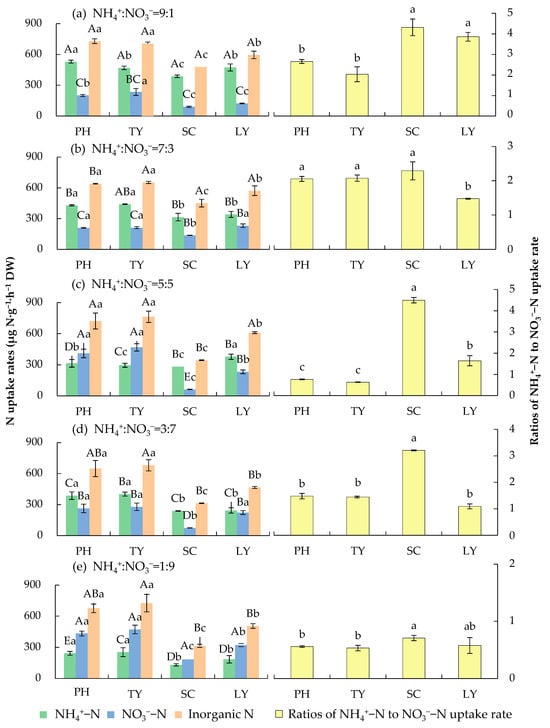 The uptake rates and ratios of NH4+-N and NO3−-N of different plants in water with different NH4+/NO3− ratios. PH, P. australis; TY, T. orientalis; SC, S. validus; LY, L. salicaria. Different uppercase letters indicate significant differences in the uptake rates of the same nitrogen form by the same plant among varying NH4+/NO3− ratios (9:1, 7:3, 5:5, 3:7, and 1:9) (p < 0.05). The different lowercase letters on the left side of the figure indicate significant differences in the uptake rates of the same nitrogen form among different plant species (PH, TY, SC, and LY) at the same NH4+/NO3− ratio (p < 0.05). The different lowercase letters on the right side of the figure indicate significant differences in the ratios of NH4+-N to NO3−-N uptake rate among different plant species (PH, TY, SC, and LY) at the same NH4+/NO3− ratio (p < 0.05).