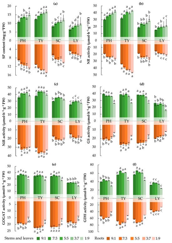 Nitrogen assimilation enzyme activities in stems, leaves, and roots of different plants in water with different NH4+/NO3− ratios. (a) SP content, (b) NR activity, (c) NiR activity, (d) GS activity, (e) GOGAT activity, (f) GDH activity. PH, P. australis; TY, T. orientalis; SC, S. validus; LY, L. salicaria. Different lowercase letters indicate significant differences in nitrogen assimilation enzyme activities among the different plants (p < 0.05).