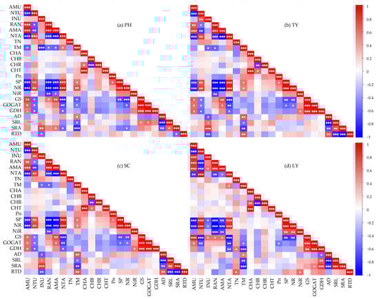 Correlations of factors affecting the nitrogen uptake rate of emergent plants. (a) PH, P. australis; (b) TY, T. orientalis; (c) SC, S. validus; (d) LY, L. salicaria. AMU, the uptake rate of NH4+-N; NTU, the uptake rate of NO3−-N; INU, the uptake rate of inorganic nitrogen; RAN, the NH4+/NO3− ratio; AMA, the uptake amount of NH4+-N; NTA, the uptake amount of NO3−-N; TN, the total nitrogen content of a plant; TM, the plant biomass; CHA, the content of chlorophyll a; CHB, the content of chlorophyll b; CHR, the ratio of chlorophyll a to chlorophyll b; CHT, the total chlorophyll content; Pn, the net photosynthetic rate; SP, the content of soluble protein; NR, the activity of nitrate reductase; NiR, the activity of nitrite reductase; GS, the activity of glutamine synthetase; GOGAT, the activity of glutamate synthase; GDH, the activity of glutamate dehydrogenase; AD, the diameter of fine roots; SRL, the specific root length of fine roots; SRA, the specific root surface area of fine roots; RTD, the tissue density of fine roots. Significance codes: *** means p < 0.001, ** means p < 0.01, * means p < 0.05.