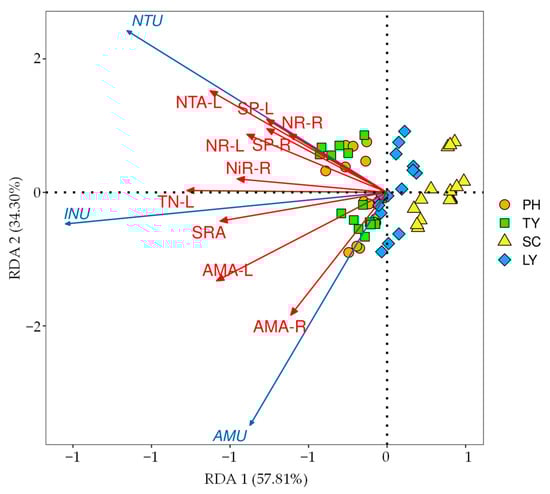 RDA of factors affecting nitrogen uptake rate of emergent plants. AMA-L, uptake amount of NH4+-N in stems and leaves; AMA-R, uptake amount of NH4+-N in roots; NTA-L, uptake amount of NO3−-N in stems and leaves; TN-L, total nitrogen content in stems and leaves; SP-L, content of soluble protein in stems and leaves; SP-R, content of soluble protein in roots; NR-L, activity of nitrate reductase in stems and leaves; NR-R, activity of nitrate reductase in roots; NiR-R, activity of nitrite reductase in roots.