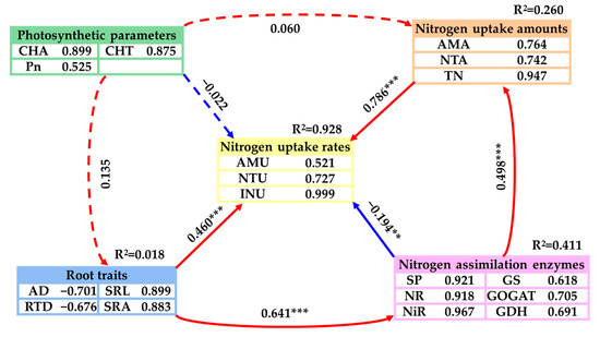 A PLS-PM showing the effects of the nitrogen uptake amounts, root traits, nitrogen assimilation enzymes, and photosynthetic parameters on nitrogen uptake rates. The blue and red lines indicate positive and negative effects, respectively. The solid and dashed arrows indicate significant and insignificant path coefficients, respectively. The numbers adjacent to each arrow denote the path coefficients (significance codes: *** p < 0.001, ** p < 0.01). The number next to each indicator represents the contribution of each predictor variable to the latent variable. The R2 values display the proportion of variance in the nitrogen uptake rate that is explained by each factor.