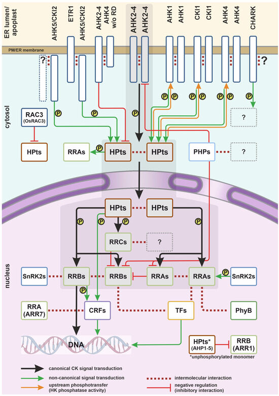 Thus, in terms of CK signal transduction, we will call the protein–protein interaction in the scheme PHP—CHK ↔ CHK → HPt → RR(—RR)—PHP “canonical” in this review (the arrows indicate the direction of hot phosphate transfer, and the lines indicate an interaction not associated with phosphorylation). All other variants of protein–protein interaction involving these components (except for the interaction with CK metabolic enzymes) we will refer to as “non-canonical”. The examples discussed in this review show how non-canonical interactions increase the variability of CK output responses compared to what would be expected from the classical CK signaling scheme. Studying non-canonical protein–protein interaction of CK signaling components may provide insight into a wide range of issues both outside and inside the CK signaling system. On the one hand, these interactions are involved in crosstalk between different signaling pathways (e.g., ethylene, red light, osmosensing, auxin, gibberellin, and others); on the other hand, they may explain the high specificity of CK transcriptional responses and their seemingly paradoxical multidirectional action.