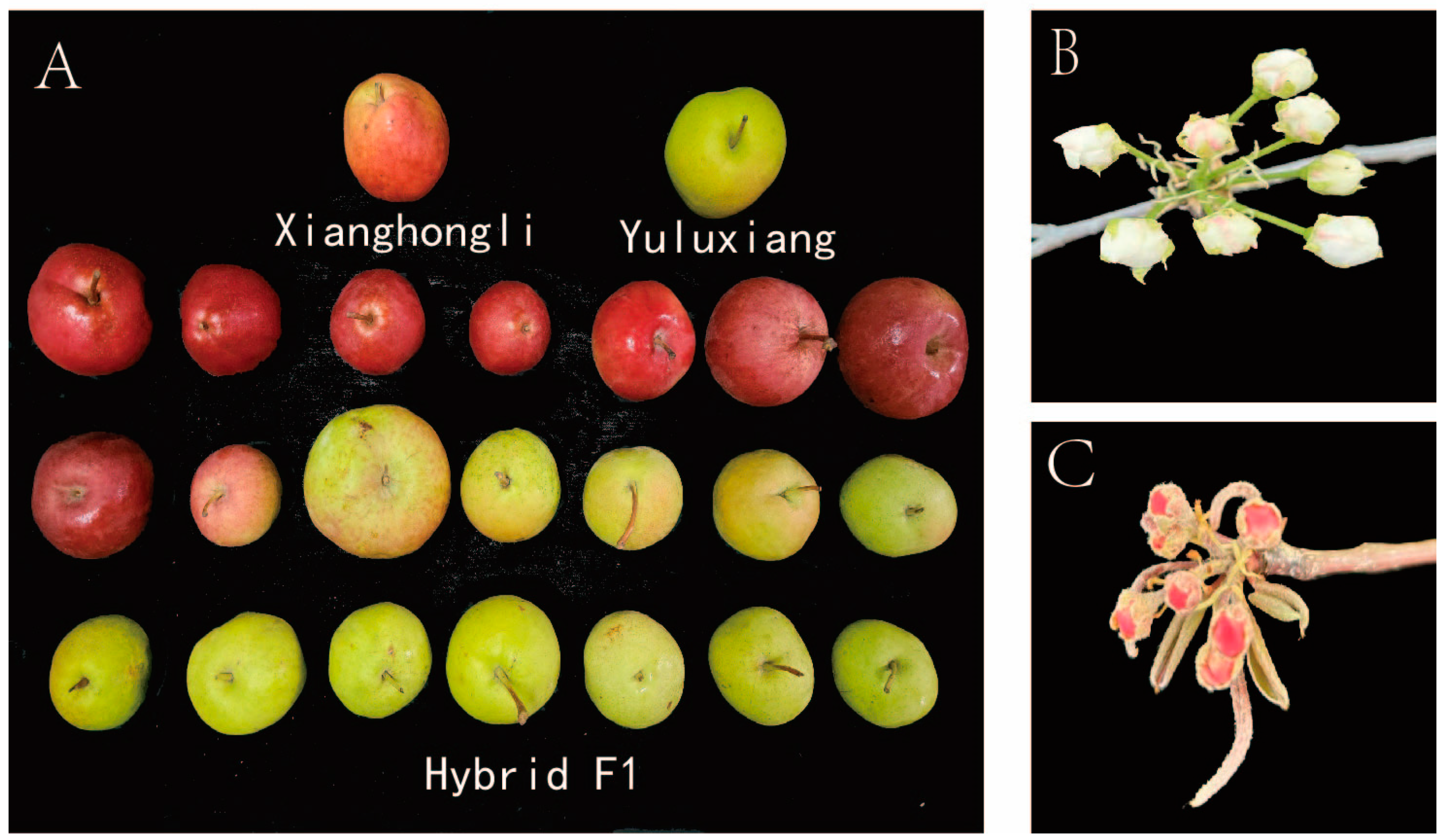 - Li, J.; An, X.H.; Shao, J.Z.; Li, W.X.; Tian, Y. Inheritance of traits of hybrid seedlings from Wanbaihaitang × Huayue apple. Jiangsu Agric. Sci. 2023, 51, 169–175. [Google Scholar]