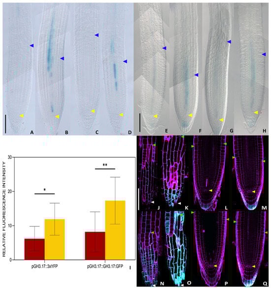 β-glucoronidase activity of transgenic plants was visualized after a 30 min vacuum treatment and a minimum of 2 h staining. GFP and 3xYFP signals were imaged using a confocal laser scanning microscope (Zeiss LSM780; Zeiss, Oberkochen, Germany). The cell wall was stained with 10 μM propidium iodide. The quantification of the fluorescence of the reporter lines was performed using the open-source software ImageJ V1.53 (https://imagej.net/ij/, accessed on 19 April 2025). Upon image calibration, the area of interest was selected with the polygon tool, then the raw integrated density (RawIntDen) and the area of the selection were measured, and the value of the fluorescence was represented by the ratio between the RawIntDen and the ROI area. The obtained values were then analyzed statistically as described in the figure legends. The analyses were performed with a sufficiently large number of samples to ensure statistical significance.