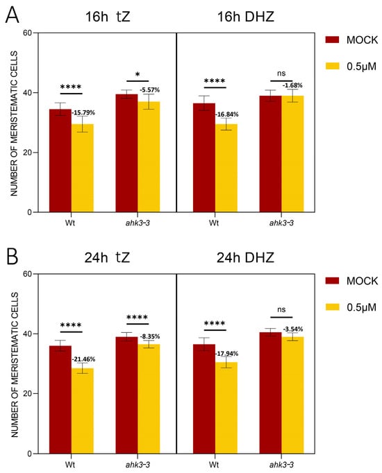AHK3 mediates DHZ activity in the root meristem. (A) Analysis of meristematic cortical cell number of Wt and ahk3-3 plants treated for 16 h with 0.5 μM tZ or 0.5 μM DHZ. Mock treatments: DMSO for tZ, EtOH for DHZ. Error bars indicate standard deviation (SD). (ns) indicates a p-value > 0.05, (*) indicates a significance with a p-value < 0.05, (****) indicates a significance with a p-value < 0.001, two-way ANOVA with Tukey’s post hoc test, N = 3, n = 15. Representative root images are reported in the Supplemental Figure S3. (B) Analysis of meristematic cortical cell number of Wt and ahk3-3 plants treated for 24 h with 0.5 μM tZ or 0.5 μM DHZ. Mock treatments: DMSO for tZ, EtOH for DHZ. Error bars indicate standard deviation (SD). (ns) indicates a p-value > 0.05, (****) indicates a significance with a p-value < 0.001, two-way ANOVA with Tukey’s post-hoc test, N = 3, n = 15. Representative root images are reported in the Supplemental Figure S3.