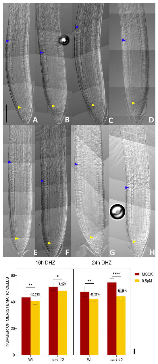 CRE1 does not mediate DHZ activity in the root meristem. (A–D) Representative DIC optical microscope images of 6 dpg Wt and cre1-12 plants. Scalebar = 100 μm. The roots were mock-treated with EtOH (A–C) or treated for 16 h with 0.5 μM DHZ (B–D). Yellow arrows indicate the QC, blue arrows indicate the last cortical cell of the meristem. Scalebar = 100 μm. (E–H) Representative DIC optical microscope images of 6 dpg Wt and cre1-12 plants. Scalebar = 100 μm. The roots were mock-treated with EtOH (E–G) or treated for 24 h with 0.5 μM DHZ (F–H). Yellow arrows indicate the QC, blue arrows indicate the last cortical cell of the meristem. Scalebar = 100 μm. (I) Analysis of meristematic cortical cell number of Wt and cre1-12 plants treated for 16 h with 0.5 μM DHZ. Mock treatment: EtOH. Error bars indicate standard deviation (SD). (*) indicates a significance with a p-value < 0.05, (**) indicates a significance with a p-value < 0.01, (****) indicates a significance with a p-value < 0.001, two-way ANOVA with Tukey’s post hoc test, N= 3, n = 10.