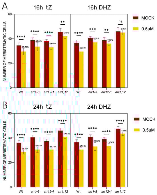 Mutations in ARR1 and 12 are not sufficient to confer resistance to tZ and DHZ in the root meristem. (A) Analysis of the meristematic cortical cell number of Wt, arr1-3, arr12-1, and arr1,12 plants treated for 16 h with 0.5 μM tZ or 0.5 μM DHZ. Mock treatments: DMSO for tZ, EtOH for DHZ. Error bars indicate standard deviation (SD). (ns) indicates a p-value > 0.05, (**) indicates a significance with a p-value < 0.01, (***) indicates a significance with a p-value < 0.005, (****) indicates a significance with a p-value < 0.001, two-way ANOVA with Tukey’s post-hoc test, N = 3, n = 15. Representative root images are reported in the Supplemental Figure S6. (B) Analysis of the meristematic cortical cell number of Wt, arr1-3, arr12-1, and arr1,12 plants treated for 24 h with 0.5 μM tZ or 0.5 μM DHZ. Mock treatments: DMSO for tZ, EtOH for DHZ. Error bars indicate standard deviation (SD). (****) indicates a significance with a p-value < 0.001, two-way ANOVA with Tukey’s post-hoc test, N = 3, n = 15. Representative root images are reported in the Supplemental Figure S7.