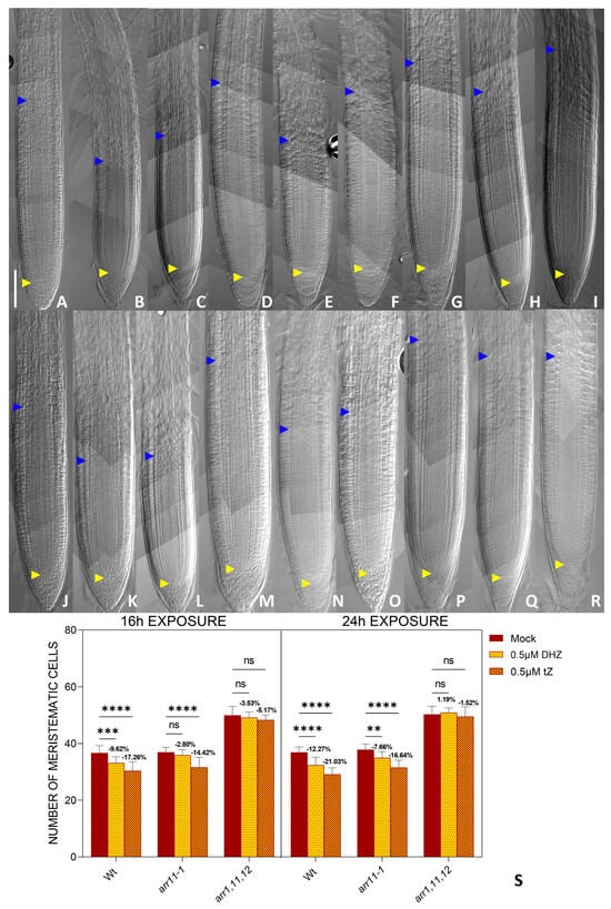 ARR11 cooperates with ARR1 and 12 to regulate root meristem size. (A–I) Representative DIC optical microscope images of 6 dpg Wt (A–C), arr11-1 (D–F) arr1, 11, and 12 (G–I) plants. The roots were mock-treated with water (A,D,G) or treated for 16 h with either 0.5 μM tZ (D,E,H) or 0.5 μM DHZ (C,F,I). Yellow arrows indicate the QC, blue arrows indicate the last cortical cell of the meristem. Scalebar = 100 μm. (J–R) Representative DIC optical microscope images of 6 dpg Wt (J–L), arr11-1 (M–O) arr1, 11, and 12 (P–R) plants. The roots were mock-treated with water (J,M,P) or treated for 24 h with either 0.5 μM tZ (K,N,Q) or 0.5 μM DHZ (L,N,R). Yellow arrows indicate the QC, blue arrows indicate the last cortical cell of the meristem. Scalebar = 100 μm. (S) Analysis of meristematic cortical cell number of Wt, arr11-1, and arr1,11,12 plants treated for 16 h with 0.5μM DHZ or 0.5μM tZ. Mock treatment: water. Error bars indicate standard deviation (SD). (ns) indicates a p-value > 0.05, (**) indicates a significance with a p-value < 0.01, (***) indicates a significance with a p-value < 0.005, (****) indicates a significance with a p-value < 0.001, one-way ANOVA with Tukey’s post hoc test, N = 3, n = 10.