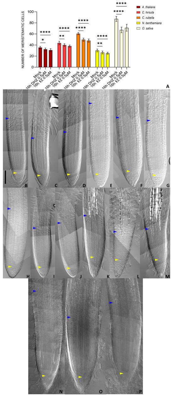 DHZ and tZ regulate root meristem size in a conserved manner. (A) Analysis of meristematic cortical cell number of Arabidopsis, Cardamine, Capsella, Nicotiana, and Oryza Wt plants treated for 16 h with 0.5 μM DHZ or 0.5 μM tZ. Mock treatment: water. Error bars indicate standard deviation (SD). (*) indicates a significance with a p-value < 0.05, (**) indicates a significance with a p-value < 0.01, (****) indicates a significance with a p-value < 0.001, one-way ANOVA with Tukey’s post-hoc test, N = 3, n = 10. (B–P) Representative DIC optical microscope images of 6 dpg Arabidopsis (B–D), Cardamine (E–G), Capsella (H–J), Nicotiana (K–M), and Oryza (N–P) plants. The roots were mock-treated with water (B,E,H,K,N) or treated for 16 h with either 0.5 μM tZ (C,F,I,L,O) or 0.5 μM DHZ (D,G,J,M,P). Yellow arrows indicate the QC, blue arrows indicate the last cortical cell of the meristem. Scalebar = 100 μm.
