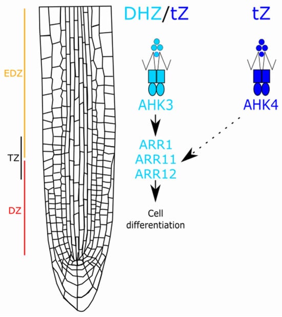 DHZ and tZ bind to AHK3 to promote the activity of the type-B ARRs ARR1-11-12, and in turn cell differentiation in the root. Differently, AHK4 binds only tZ and might activate cell differentiation via the same ARRs.