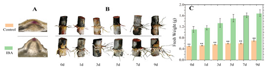 The effect of IBA on sugarcane root development under low-temperature conditions. (A) Root primordia formation in seedcane at 15 days after the first IBA treatment. (B) Root system development in seedcane at 0, 1, 3, 5, 7, and 9 days after the second IBA treatment. (C) Fresh root weight of seedcane at 0, 1, 3, 5, 7, and 9 days after the second IBA treatment. The orange bars represent the control treatment, while the green bars represent the IBA treatment. Asterisks (**) denote a statistically significant difference (p < 0.01) between the control and IBA treatments at each time point.