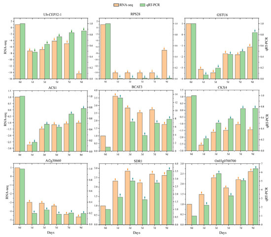 To validate the accuracy of RNA-seq-derived gene expression data, nine hub genes with high connectivity in the co-expression network were selected for quantitative real-time PCR (qRT-PCR) analysis. The qRT-PCR results showed expression patterns consistent with those obtained from RNA-seq, thereby confirming the reliability of the transcriptomic data (Figure 6).