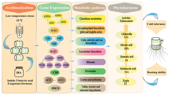 Taken together, under low-temperature stress, IBA enhanced the activities of phytohormones in sugarcane roots, primarily by inducing the expression of the CICDH, GSTF11, GSTU6, GST1, GST4, BCAT3, HIBCH, FAR1, FAR2, FAR5, AGAL1, Ub-CEP52-1, PRL19A, RPS28, RPS25B, ACS1, RPP3A, RPS3C, and ACC1 genes, thereby regulating the pathways of glutathione metabolism; peroxisome; cutin, suberine and wax biosynthesis; glucosinolate biosynthesis; valine, leucine and isoleucine degradation; and glycosphingolipid biosynthesis (globo and isoglobo series). Consequently, sugarcane roots overcame low-temperature stress, leading to enhanced root system development (Figure 7). This study offers novel insights into the molecular mechanisms through which IBA promotes root development under low-temperature conditions, providing a valuable theoretical basis for improving cold resilience in sugarcane and other crops.