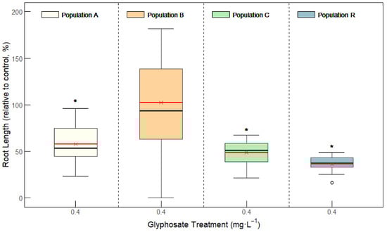 Root length in populations A, B, C, and R of Amaranthus palmeri from Aragon. Box plots show 1st, 2nd, and 3rd quartiles; the minimum and maximum; and the mean (red line) (n = 15–20). Root length (Y axis) is expressed as percentage of non-treated samples of each population. For each population, significant differences between treated roots (0.4 mg L−1 of glyphosate) and non-treated are highlighted with * (Student’s t test; p value < 0.05).