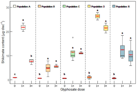 Shikimate content in leaves of populations A, B, C, D, and R. Plants were untreated (control, 0) or sampled 5 days after treatment with glyphosate, applied at 1× (0.84 kg a.e. ha−1) and 3× (2.52 kg a.e. ha−1) the field rate. Box plots show 1st, 2nd, and 3rd quartiles; the minimum and maximum; and the mean (red line) (n =4). In each population, different letters indicate significant differences between treatments (ANOVA; HSD Tukey; p value < 0.05).