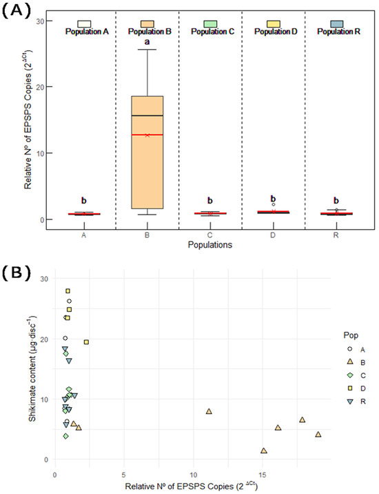 (A) Amaranthus palmeri genomic copy number of 5-enolpyruvylshikimate-3-phosphate synthase (EPSPS) relative to carbamoylphosphate synthetase (CPS), expressed as 2ΔCt in the populations of Aragon: A, B, C, D, and R. Box plots show 1st, 2nd, and 3rd quartiles; the minimum and maximum; and the mean (red line) (n = 6–12). Different letters indicate significant differences between treatments (ANOVA; HSD Tukey; p value < 0.05). (B) Correlation between genomic copy number of EPSPS and shikimate accumulation in treated individuals of all populations (Pop). Shikimate accumulation was measured after five days of treatment with 1× (0.84 kg a.e. ha−1) or 3× (2.52 kg a.e. ha−1) glyphosate field rates.
