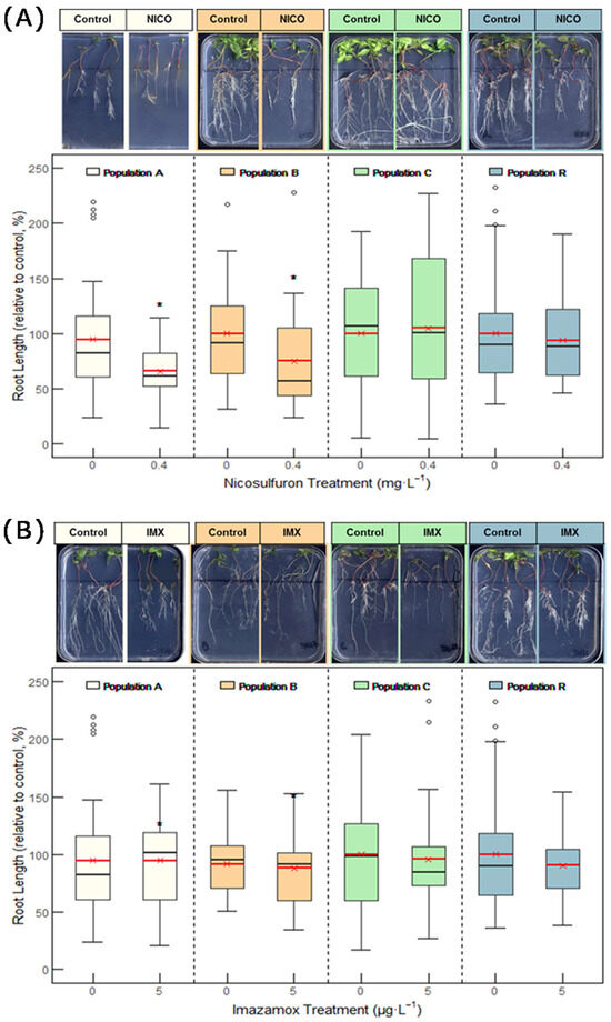 Root length in populations A, B, C, and R of Amaranthus palmeri from Aragon, treated with nicosulfuron (A) or imazamox (B). Box plots show 1st, 2nd, and 3rd quartiles; the minimum and maximum; and the mean (red line) (n = 15–20). Root length (Y axis) is expressed as percentage of non-treated samples of each population. For each population, significant differences between treated and non-treated samples are highlighted with * (Student’s t test; p value < 0.05). Representative response of each population is shown (top of the figure).