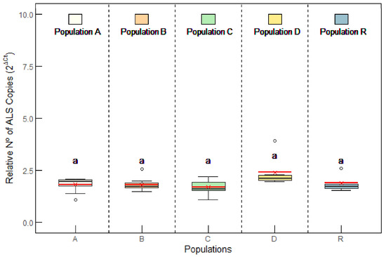 Amaranthus palmeri genomic copy number of acetolactate synthase (ALS) relative to carbamoylphosphate synthetase (CPS) in populations of Aragon: A, B, C, D, and R. Box plots show 1st, 2nd, and 3rd quartiles; the minimum and maximum; and the mean (red line) (n = 6–10). No significant differences in ALS gene copy numbers were detected among populations (ANOVA; p value < 0.05).