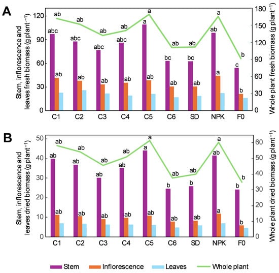 Effect of the different treatments on the fresh (A) and dried (B) biomass accumulation in the stem, inflorescences, leaves, and whole hemp plant. C1–C6, composts 1–6; SD, non-composted solid digestate; NPK, inorganic fertilization; F0, no fertilization. For each tissue, different lower-case letters represent significant differences among treatments (Tukey’s test p ≤ 0.05).