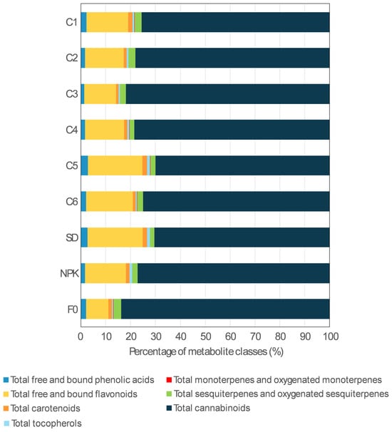 Composition of the secondary metabolite profile in the inflorescences of the hemp plants grown under the nine treatments. For each treatment, the percentage of each class of metabolites was calculated in relation to the sum of all the metabolites detected in that treatment. C1–C6, composts 1–6; SD, solid non-composted digestate; NPK, inorganic fertilization; F0, no fertilization.