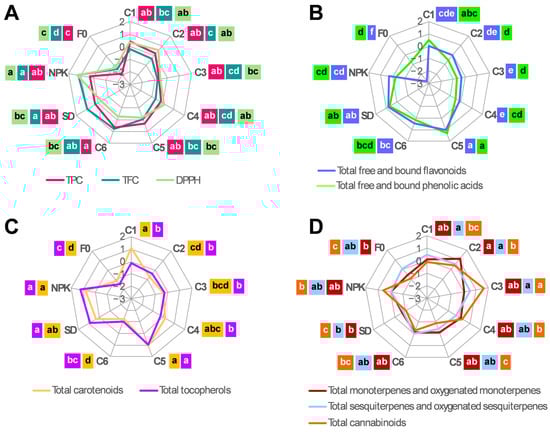 Radar charts comparing TPC, TFC, and DPPH (A), total flavonoid and phenolic acid content (B), total carotenoid and tocopherol content (C), and total monoterpene, sesquiterpene, and cannabinoid content (D) detected in the inflorescences of the hemp plants from the cv Eletta Campana grown under the nine treatments. To represent the traits on the same scale, values from each trait were normalized by subtracting the mean and dividing by the standard deviation. Tukey’s multiple test (p ≤ 0.05) was carried out for each class of metabolites, and the result obtained is reported with lower-case letters highlighted with the same color as the corresponding class. C1–C6, composts 1–6; SD, non-composted solid digestate; NPK, inorganic fertilization; F0, no fertilization; TPC, total phenolic content; TFC, total flavonoid content; DPPH, 2,2-diphenyl-1-picrylhydrazyl.