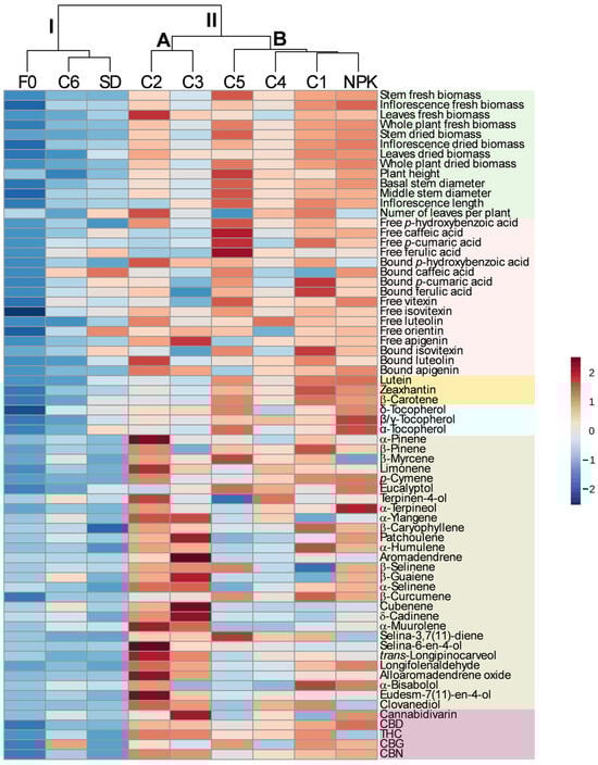 Hierarchical cluster analysis (HCA) combined with the heatmap was carried out on the dataset including all the traits related to plant morphology, biomass accumulation, and the yield per plant of the individual phytochemicals. The results obtained are reported in Figure 4. The HCA identified two clusters, cluster I and cluster II, with the latter including two subclusters, subcluster A and subcluster B. Cluster I included treatments C6, SD, and F0, which were characterized by the lowest growth performances and yield per plant of most of the individual phytochemicals. Subcluster A included treatments C2 and C3, which had intermediate growth performance and yield of phenolic compounds, carotenoids, and tocopherol, as well as high yield of terpenes and cannabinoids; whereas subcluster B included treatments C1, C4, C5, and NPK, which showed medium-to-high growth performances and yield of phenolic compounds, carotenoids, and tocopherol; C1 and NPK were distinguished from C4 and C5 by the higher yield of terpenes and cannabinoids.
