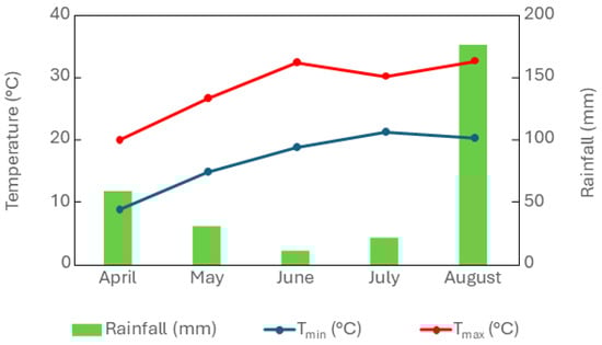 The crop was hand-sown on 4 May using 40 kg ha−1 of seeds with an inter-row spacing of 20 cm. A randomized block experimental design with four replicates was used to distribute the nine treatments in the field, and each experimental unit had a surface area of 12 m2. Plants were drip-irrigated only if necessary. Manual weed control was used during the initial stages of crop development. Female plants were harvested at the phenological stage corresponding to full flowering, encoded as BBCH 67 [49]. During the experimental period, rainfall and minimum and maximum air temperature were registered, and the data are reported in Figure 5. The monthly means of maximum temperature were higher than 30 °C in June and August. Total rainfall was 300 mm, of which 177 mm fell in August.