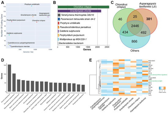 We explored the comparative nuclear genome size and the number of protein-coding genes across eight red seaweeds with whole genome data available (Figure 1A). Asparagopsis taxiformis (L6) was revealed to have the largest genome at 142.472 Mb for the eight red seaweeds assessed, yet it ranked third in terms of the total number of protein-coding genes. For comparison, the Porphyra umbilicalis genome is predicted to encode 13,125 putative genes and to have a total genome size of 87.889 Mb [1]. In total, the A. taxiformis (L6) genome contained 6737 single exon (monoexonic) genes (64.32%), with monoexonic genes a commonly reported feature of seaweed protein-coding sequences. For example, in the red seaweed C. crispus, genes are remarkably compact, containing only 1.32 exons on average (i.e., many fewer than other organisms of similar genome size), and most genes (88%) are monoexonic [24].