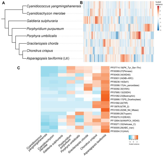Ortholog analysis was performed on eight red seaweed genome-derived proteome datasets (72,277 proteins) that had been subjected to all-against-all BLASTp analysis (E-value of 0.00001). This analysis clustered 56,813 proteins (78.6%) into 9841 orthologous groups, which were used to construct a species tree (Figure 2A,B). Among the orthologous groups, 2430 (11,578 proteins) were species-specific. Interestingly, 15,148 putative gene duplication events were identified among the 8 genomes, all of which are traced back to the node of the species tree on which these duplications occurred. For A. taxiformis (L6), there were 1359 non-terminal duplications. These were mapped to 1233 Pfam domains, and the number of genes in each protein family from each species was aligned with the species tree.